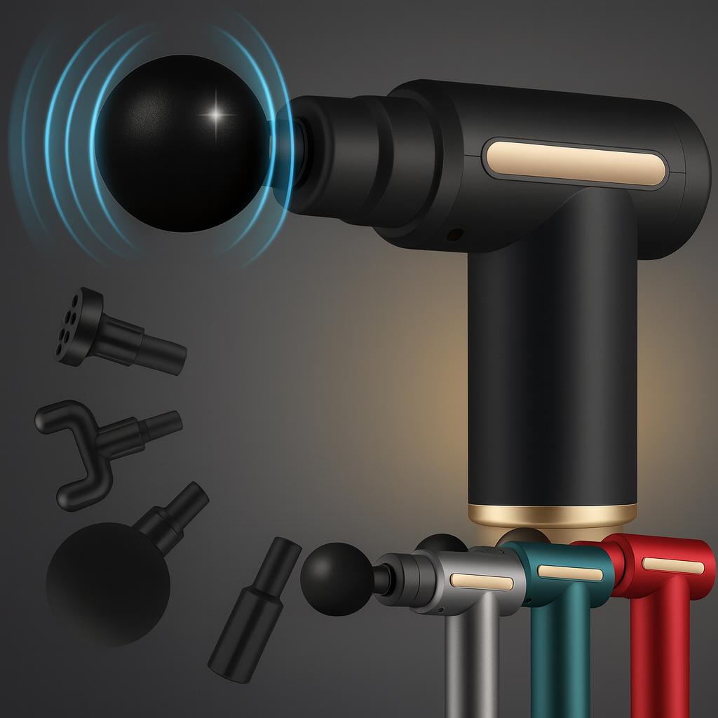 This image showcases the multiple massage heads designed to target every major muscle group with precision. Each attachment delivers a different style of relief, allowing you to customize your recovery experience. The sleek design and solid construction highlight the device’s performance and durability. With several color options and interchangeable heads, it offers a complete and flexible solution for daily muscle relaxation and deep tissue care.